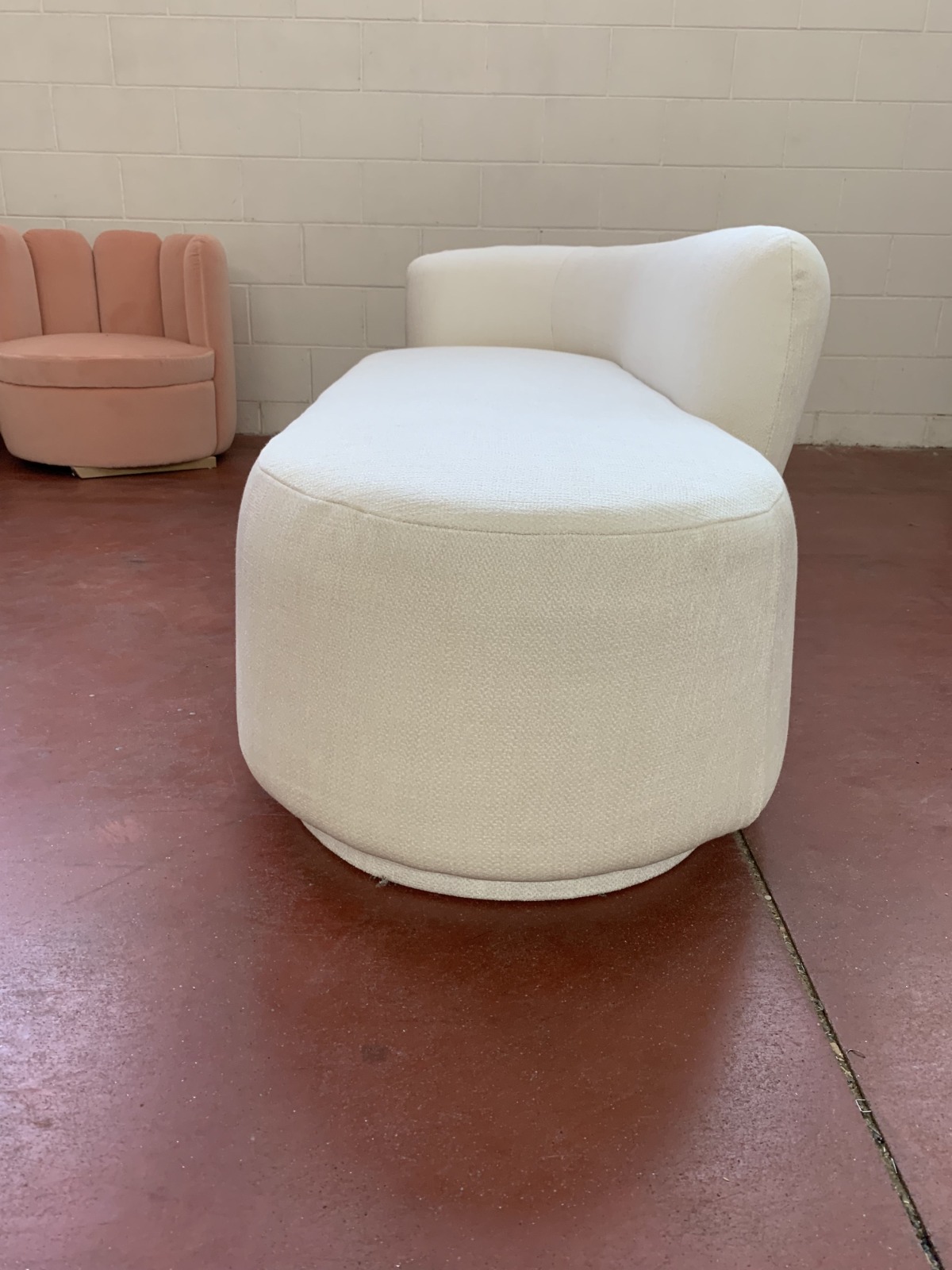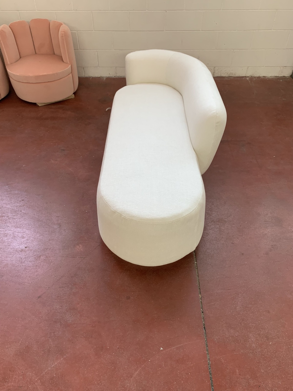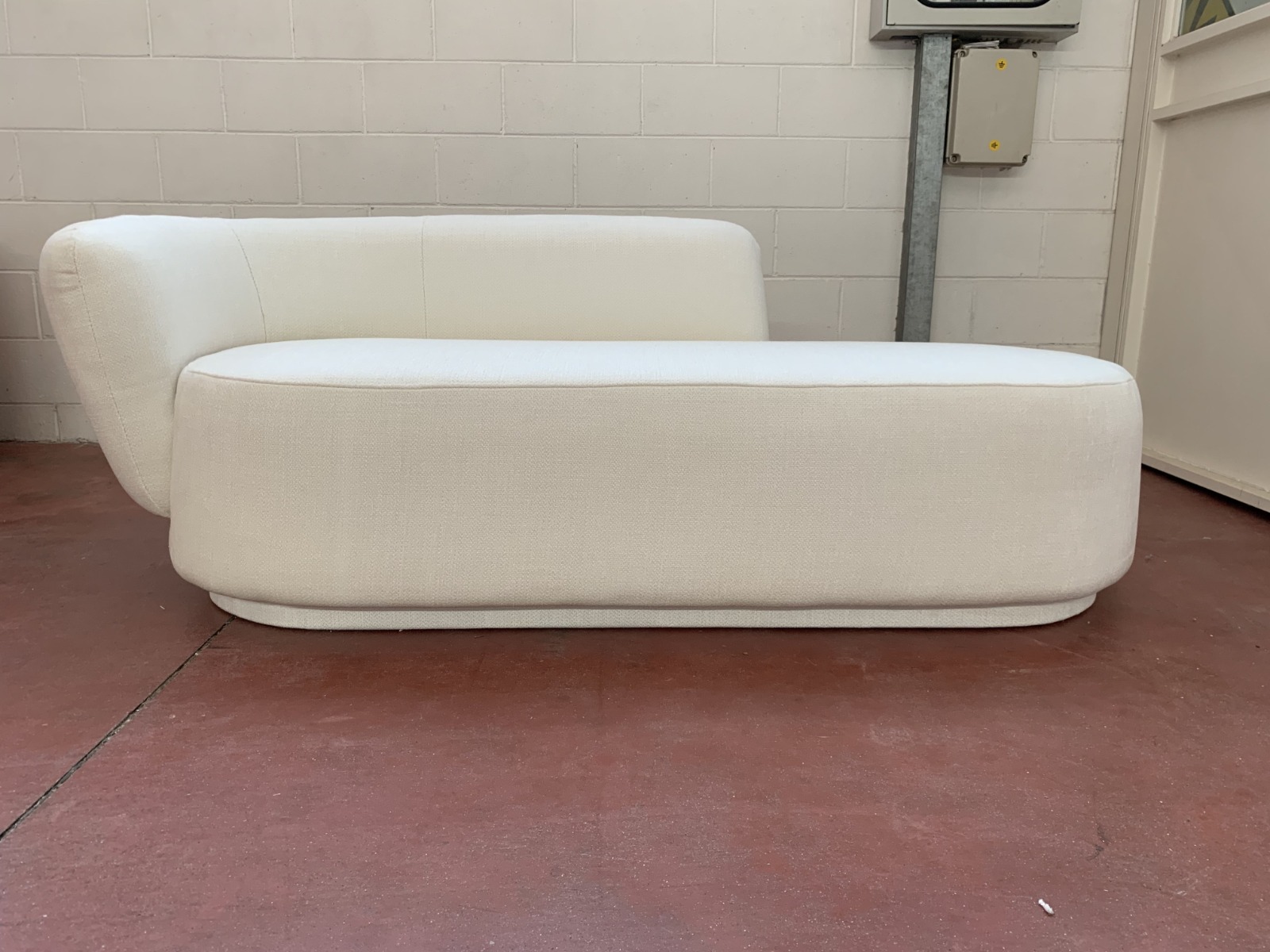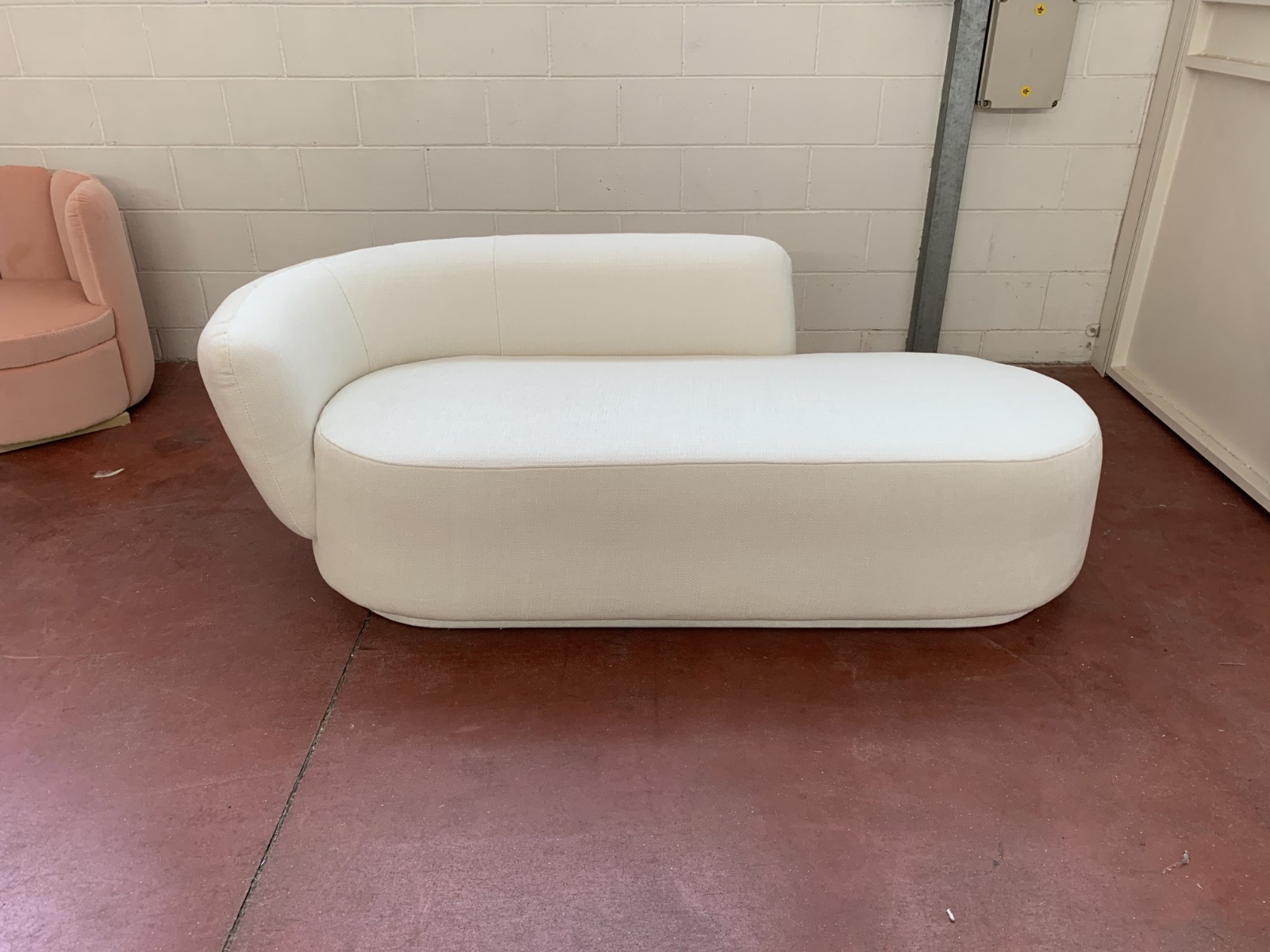 Realizzata su disegno dell’architetto di un nostro cliente, questa chaise longue presenta una struttura in massello di legno e un basamento rivestito nello stesso tessuto del rivestimento in cotone bianco, creando un insieme armonioso e sofisticato, perfetto per aggiungere comfort e stile a qualsiasi ambiente.