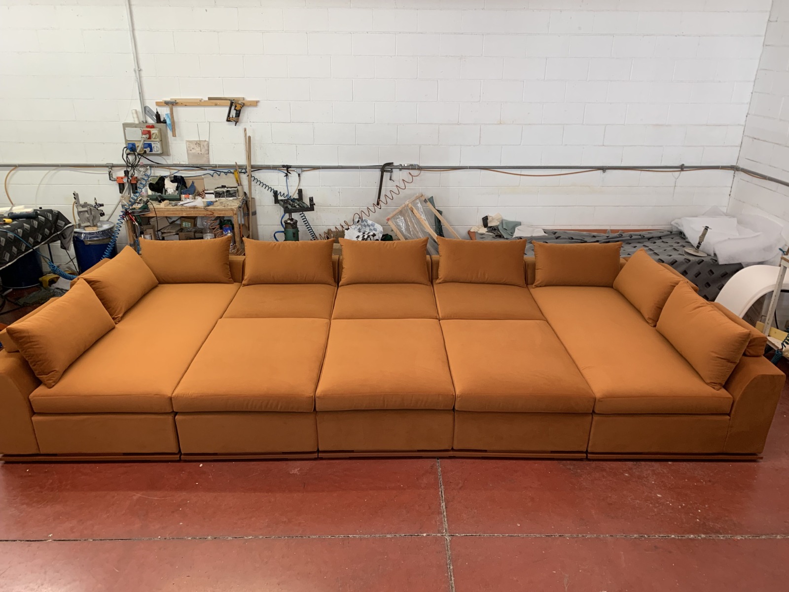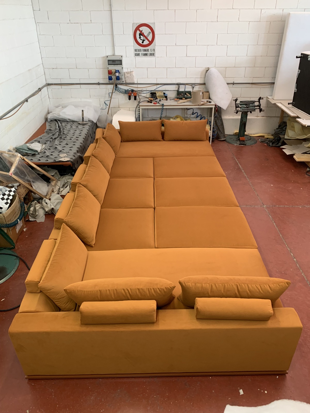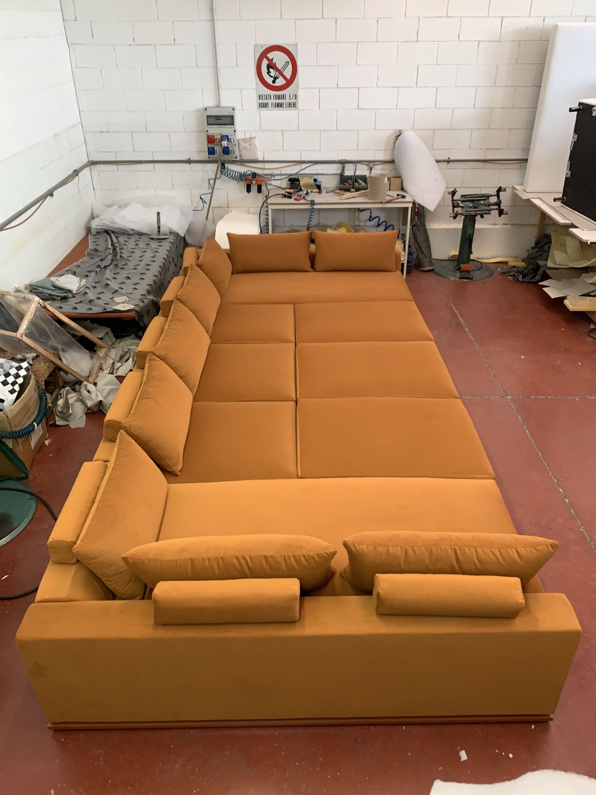 Per la zona cinema di una villa in Arabia Saudita, abbiamo realizzato un divano di grandi dimensioni, composto da 8 sezioni separabili: 2 chaise longue per lato, 3 elementi senza bracciolo e 3 pouf. Il basamento in legno a vista laccato e il rivestimento in velluto arancio conferiscono un design elegante e confortevole, perfetto per creare un ambiente accogliente e scenografico.